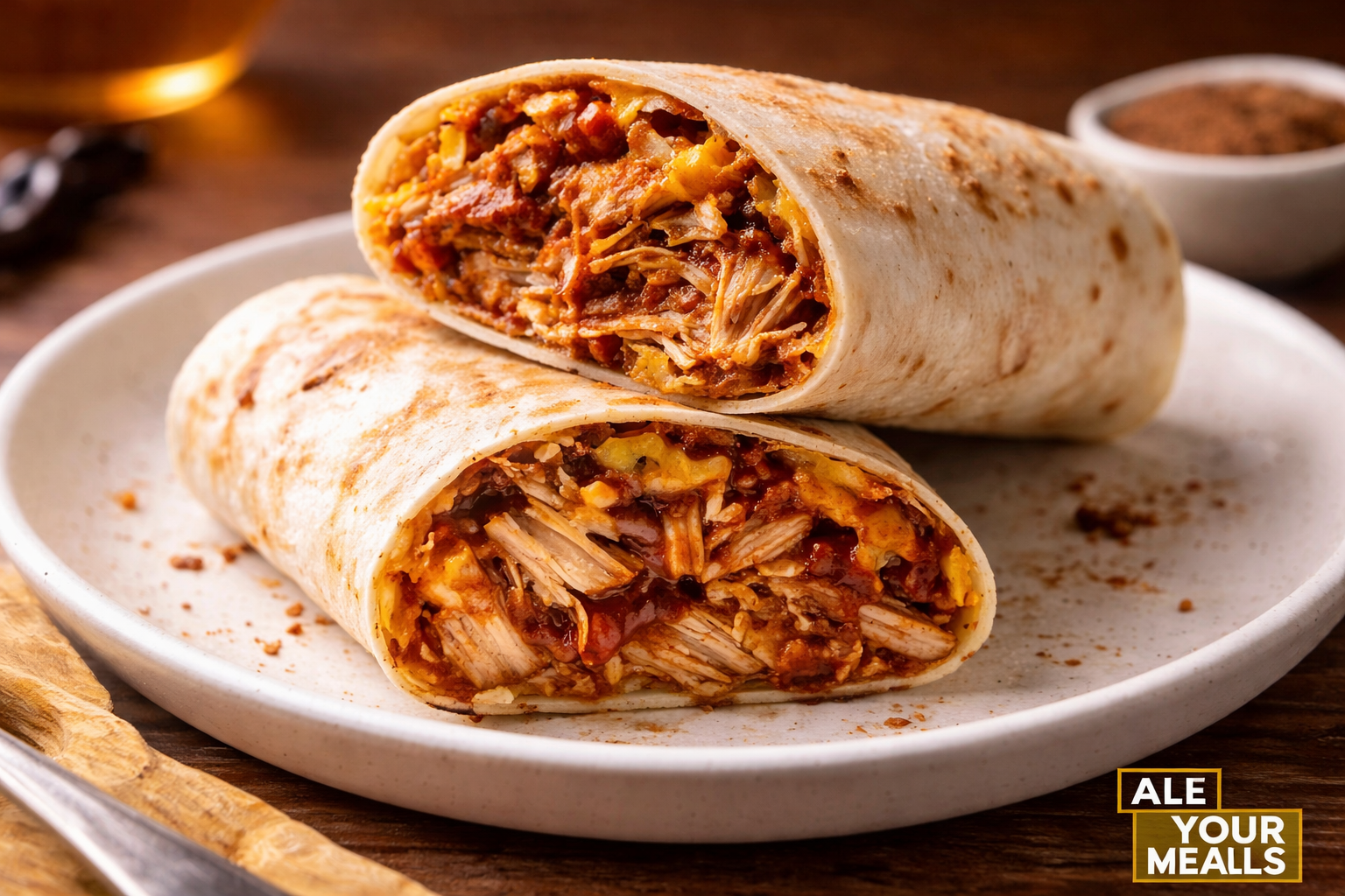 Tender shredded chicken breast tossed in a smoky, tangy BBQ sauce, wrapped in a soft tortilla with melted cheddar cheese and a blend of savory spices.